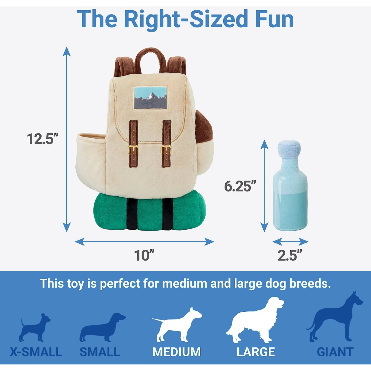 - Camping backpack plush toy packs all the playtime fun with built-in squeakers and plush water bottle.