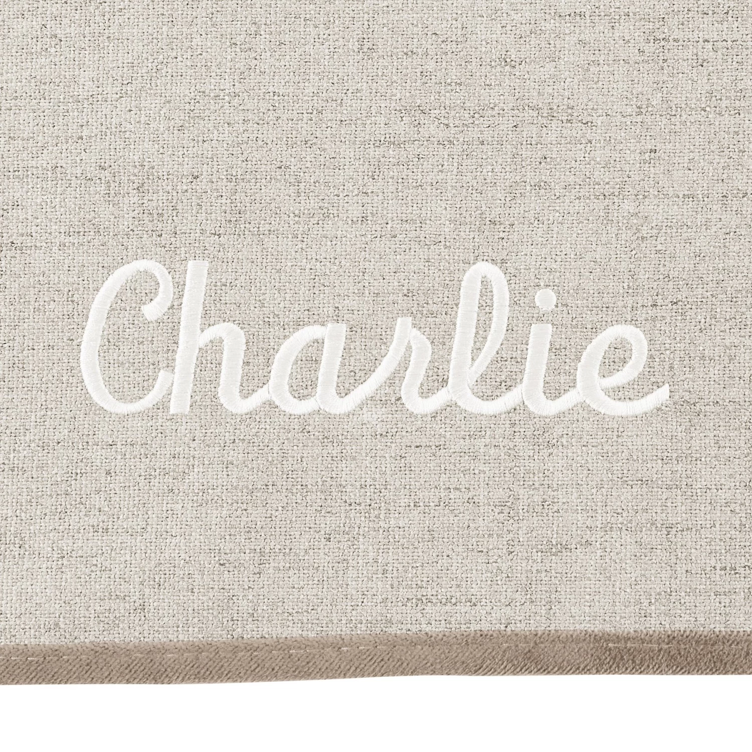 - Choose from light grey or dark grey thread for embroidery and choice of flair script or block caps font.