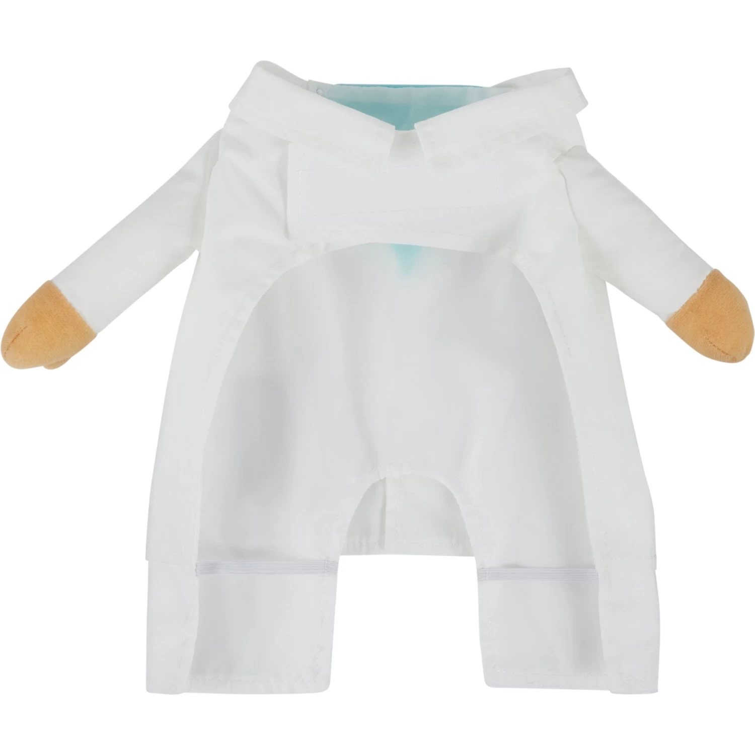 - Features a white doctor’s coat with scrubs and a stethoscope so your furry friend can operate on getting snacks into their bellies.