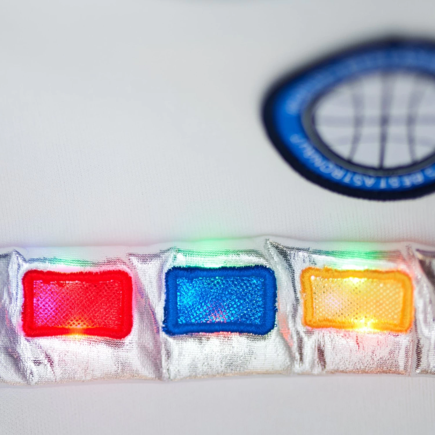 - The astronaut space suit features LED lights at the center and various patches on the arms and chest.