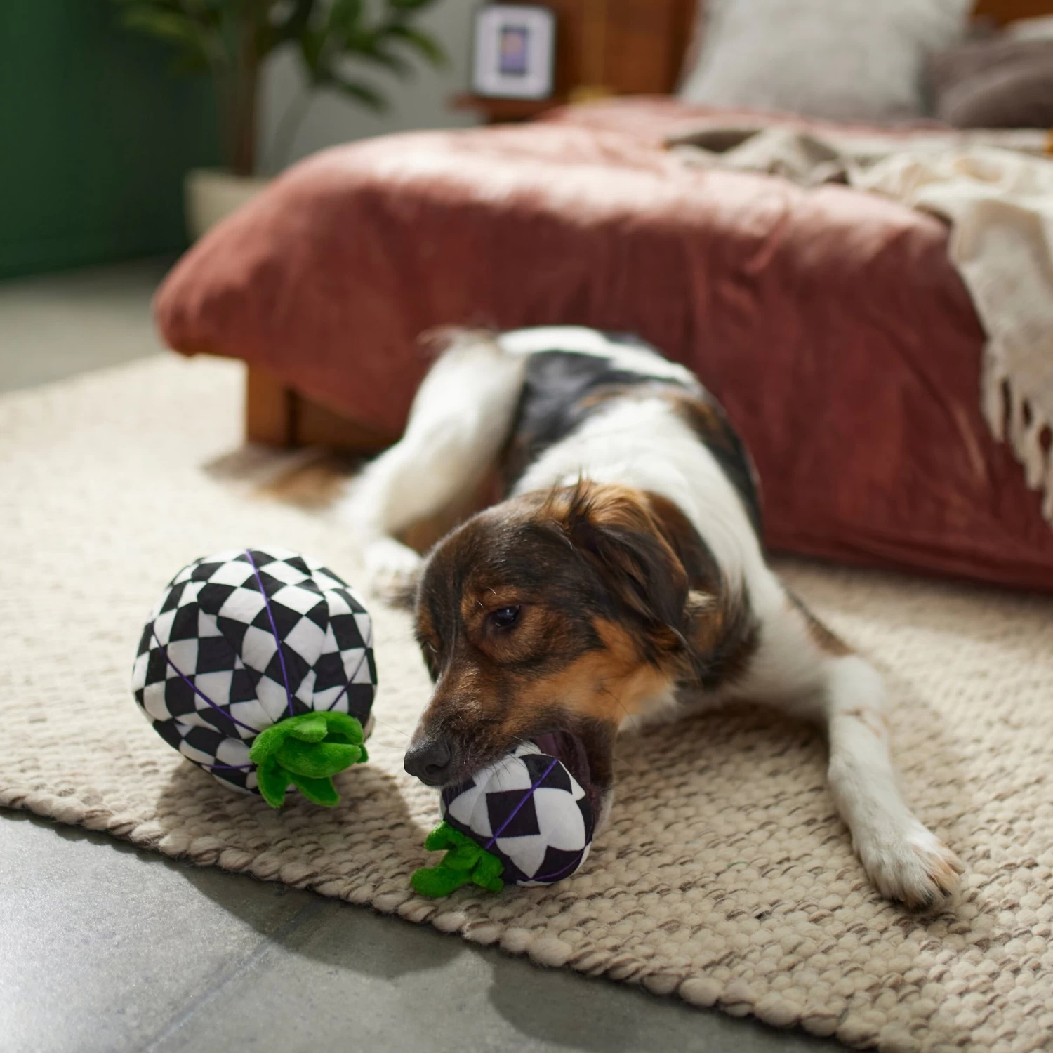 - Plush, two-in-one pumpkin toy with a fancy, black-and-white checkered pattern.