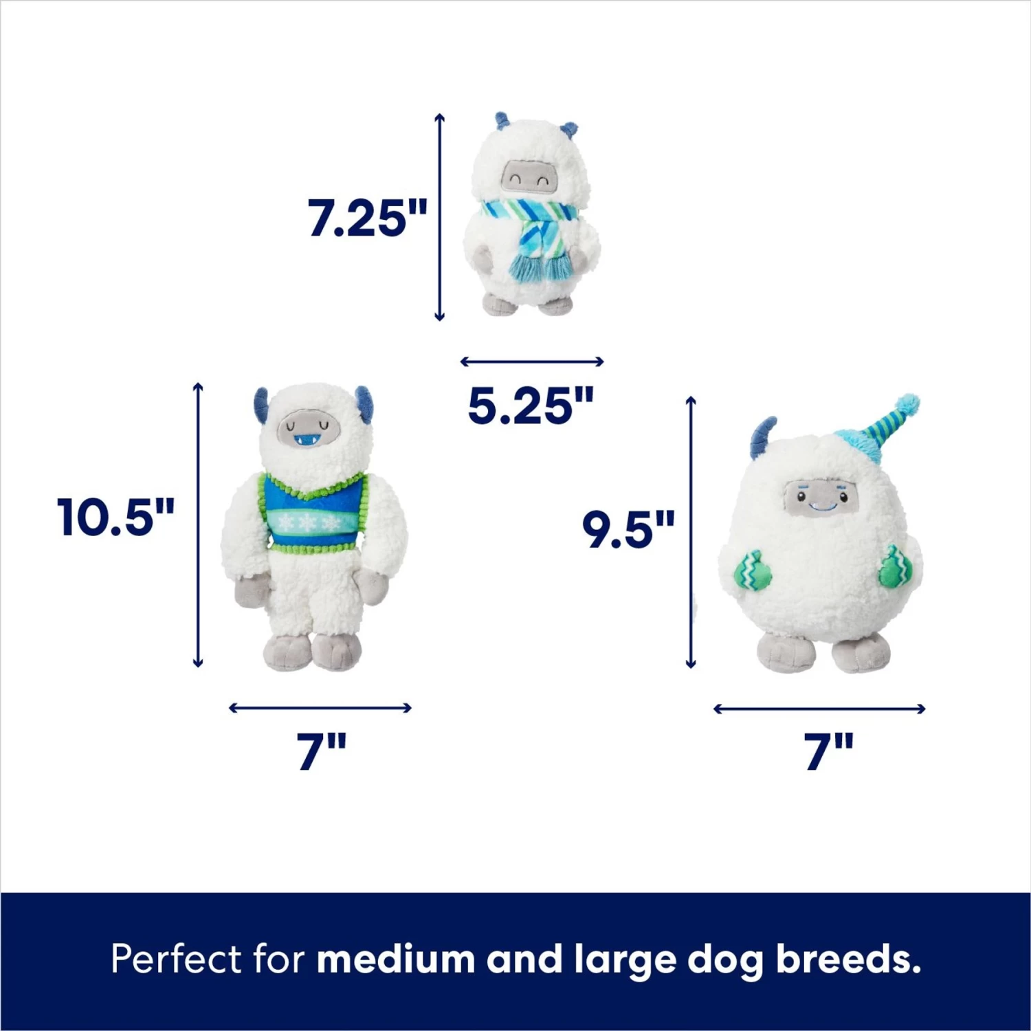 - Three friendly yeti toys give your pup a whole new gang of plush pals to celebrate the season with.