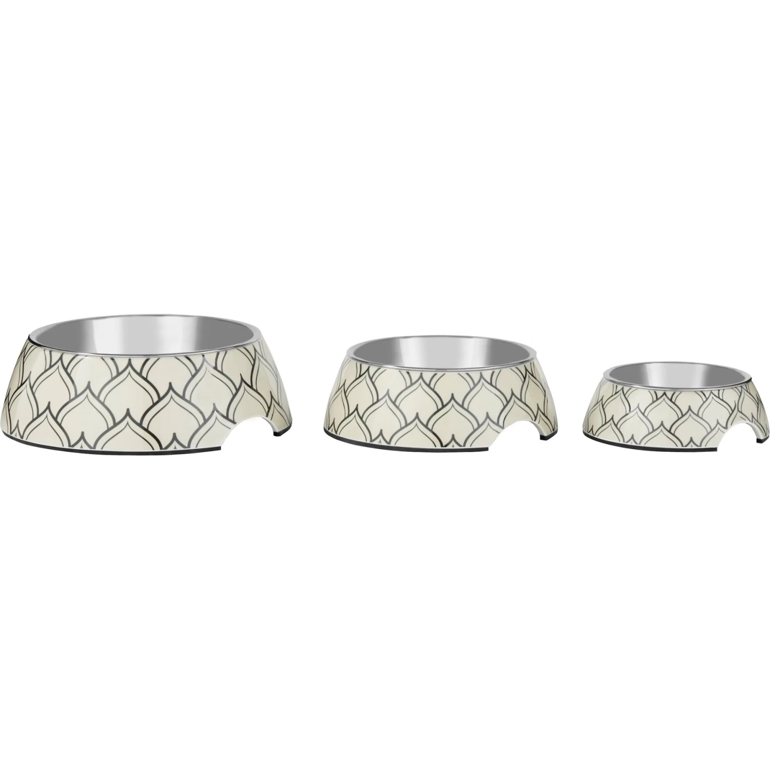 - Melamine base features a Moroccan print that elevates your dog’s dining experience.