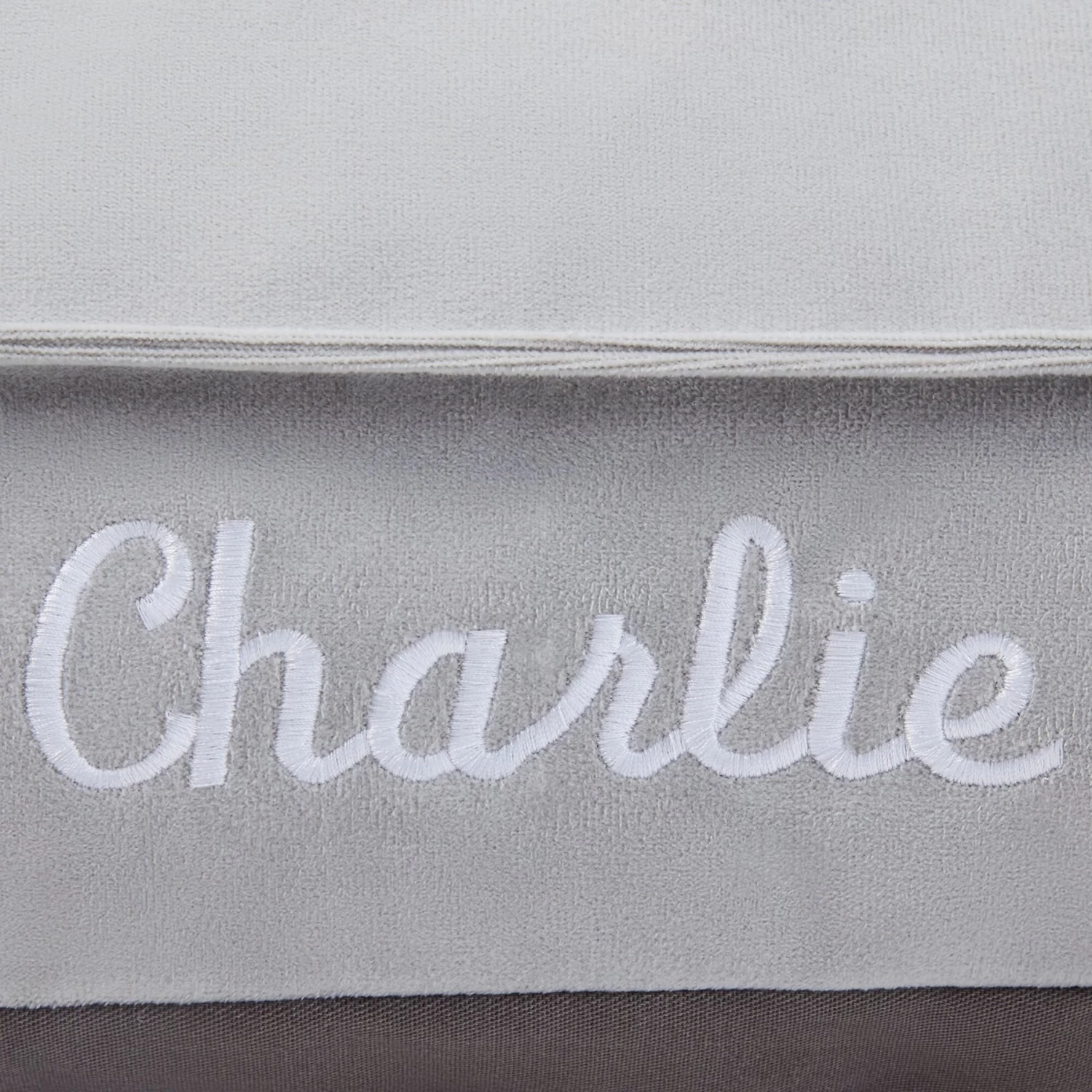 - Back bolster-style bed, customizable with up to 10 1-inch characters, perfect for their name.
